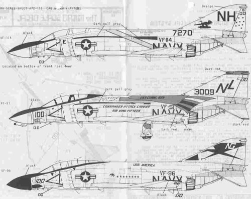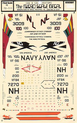 The final example on this sheet covers the CAG for the USS America's "Fighting Falcons," VF-96, NG-100. VF-96 garnered a great deal more fame in later cruises aboard the USS Constellation when CAG bird "Showtime 100" was flown into history by the Navy's only aces of Vietnam, Lt. Randy "Duke" Cunningham, and his RIO, Lt. j.g. Willie Driscoll. VF-96 only took one cruise aboard the America, from April to December 1970. Modelers looking to model Showtime 100 will need additional decals to be an accurate representation of its more famous markings.