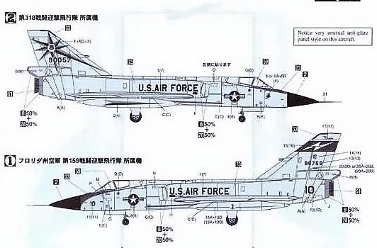 This set includes basic stencils although not as complete as the Superscale/Microscale sets have. I am impressed with the aircraft ID stencils (reference instruction letters N and O) which accurately identify 59-0057 and 58-0766. Neither set has the vertical, tail-navigation light decal. The national insignia are multi-piece so you'll have to put the red stripes on separately if you have to use these - instead of some spares. Curiously, they include complete and multi-part decals for the USAF Outstanding Unit Award insignia used on the 159th FIS aircraft. It reminds me that one should work smarter, not harder! More decals for the spares box, eh!