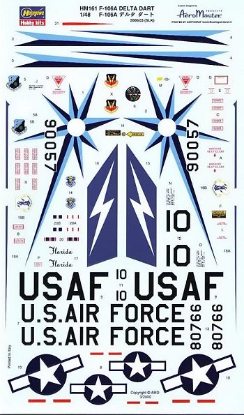 This decal set includes markings for two F-106As. First is 59-0057 from the 318th Fighter Interceptor Squadron, Air Defense, Tactical Air Command, stationed at McChord AFB, Washington. The 318th was one of the last active-duty squadrons to operate the F-106 - from 1960 to 1983 - when they converted to F-15As, which they flew until 1989 when the squadron was deactivated. A unique, straight, anti-glare panel was painted on 318th F-106s during the early 1980s and is accurately depicted on this set's instructions. These 318th markings are very accurate color-wise. (Note: Expert's Choice offers set 48-14 with similar 318th FIS markings.)
