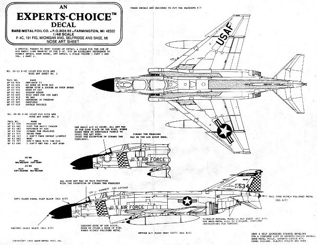 Custom printed by Microscale and copyright 1992 by Bare-Metal Foil Company (www.bare-metal.com), these sheets emphasize the color of the 171st during the F-4C era. Overall I would rate them as good. I have three small criticisms however. The upper, aft-fuselage walkway on both sets are slightly off register, the "Ejection Seat & Canopy" markings are barely legible on the warning triangles, and the nose art "Double Trouble" on 48-32 has the word double printed in black only. It should be yellow with black trim. Not too bad really!
