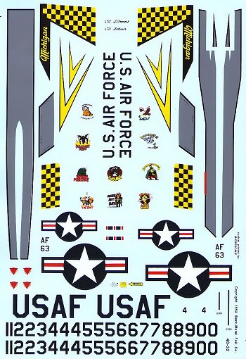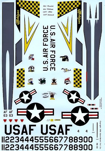 Since all but one aircraft serial numbers are from 1963 the tail number prefix decals are printed with that year and each sheet contains plenty of numerals to build the tail number of your choice. Two numeral "4s" are provided on 48-40 for the two different versions of 64-0707 – "I Don’t Take Defeat Lightly" or "Don’t Mess With The Kid." (The "4s" are on 48-32 as well but not needed for the nose art provided.) Some of the 171st aircraft used numeric tail codes just above the exhausts during their careers as well so check your references for those, as they are not specified in the instructions. You can use the extra tail number decals for most aircraft as the appropriate tail code. By the way, two other aircraft have two versions of nose art. 63-7442 "Shadow Demon" is on 48-32, and "Baby" is on 48-40. 63-7666 "This One’s For You" is on 48-32 and "I Don’t Get Mad I Get Even" is on 48-40. Pilot and WSO names are included for three aircraft. 63-7534’s "Defiance II" crew is on 48-32. 63-7529’s "Trussst Me" crew and 63-7536’s "Cirano The Fearless" crew are on 48-40.
