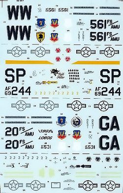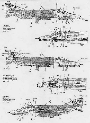 The sheet includes 1991 and 1992 markings for two F-4Gs of the 35th and 52nd Fighter Wings. By August 17, 1990, 24 F-4G Advanced Wild Weasels from the 561st Tactical Fighter Squadron and more than 1,062 personnel from George AFB had been deployed to the small island-nation of Bahrain just off the coast of Saudi Arabia. As the deployment continued, the need for personnel and equipment grew. Soon another 24 Weasels from the 81st TFS (52nd TFW, Spangdahlem Air Base, Germany), to form the 35th Tactical Fighter Wing (Provisional) joined the 561st. This sheet also has an F-4E from 1992 of the 35th FW but they did not participate in DS/DS.