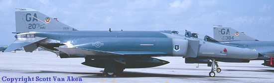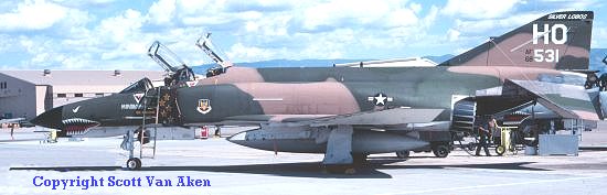 Lastly is the F-4E, s/n 68-0531, the Squadron Commander’s aircraft from the 20th FS, ‘The Silver Lobos’, of the 35th FW, with the GA – George AFB – tail code. This E-model went to AMARC on 22 October 1997(Just days after this photo was taken on 3 October 1997. As you can see from the second photo below, it was painted as one of Richie and DeBellevue's ace-making F-4Es for a commemorative flight by the pair. It now sits on the display line at AMARC, Ed).
