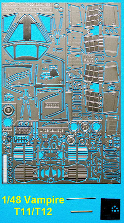 This other reference from Flightpath is dedicated to the Vampire trainer from Classic Airframe range, aside the fighter declination. This time the packet contains 133 parts with the instrumentation on a clear film and 2 metal rods. The parts are very similar to the single seat up date set, covering the cockpit, the fuselage and the wings details. The differences are due to the trainer specifications: the exterior canopy airframe obviously change for the “two side” layout front fuselage, the forward reinforcements for armaments are deleted, but aside the different shape for the instrument panel, we’ll find the pilots belts (why not included in the single seat fret?). Here again the 7 pages notice accompanied by 14 color pictures is the true example of what serious products must include to be completed, and modellers will appreciate that. So, recommended without hesitation.