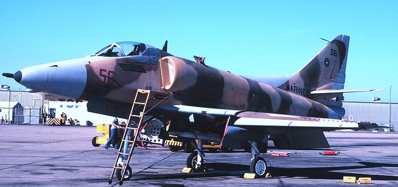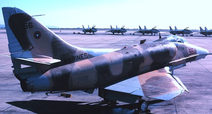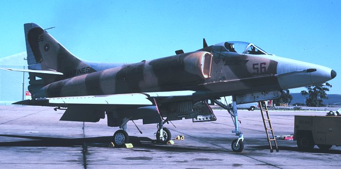 One day in mid 1981 while contemplating the fact that the Navy was finally getting into the lo-vis business, (why they didn’t think of lo-vis while flying airplanes with gloss white bottoms, black noses, and some of the most colorful paint schemes ever applied to Naval aircraft into the most intense air defenses in the history of air warfare over a country that was mostly green and brown, I’ll never know). I thought, "if they’re using the A-4 to simulate the –17, why not try to make the A-4 look like a MiG?