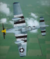 The photographer probably used a "Speed Graphic" press camera to take the original photo. This camera had a focal plane shutter, in which exposure time is controlled by the width of a slit that moves across the camera's focal plane. This particular type of shutter causes interesting distortions when photographing moving objects - most famously the pictures of old race cars in which the wheels are tilted forward. Propellers photographed with focal plane shutters are also distorted. The blades are bent, and are wider on one side, thinner on the other. In the source photo for "Mustang", the two front blades are elongated so much that the tips are vertical, while the rear blades almost disappear behind the spinner. I like the way it looks – it conveys movement and power.