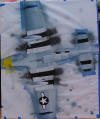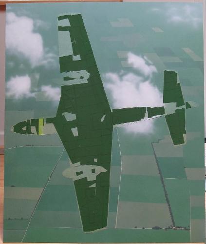 The Mustang was in direct sun, and so the tanks, scoop, rear fuselage, and pitot tube cast shadows. These shadow areas cut across panels and colors, so I applied new pieces of frisket, then drew and cut out the contours of the shadow areas. A delicate, transparent misted-on layer of blue-black gave the shadow effect.