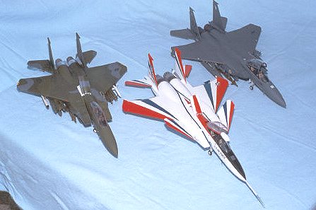 Recently, I along with two friends Cliff Armstrong and Stephen Thrum, formulated an idea to build differing versions of the same aircraft. This was all for fun and as a side diversion to our usual club activities. We all build in 1/48th scale and our first choice was the F-15 Eagle. You can see below the finished products.