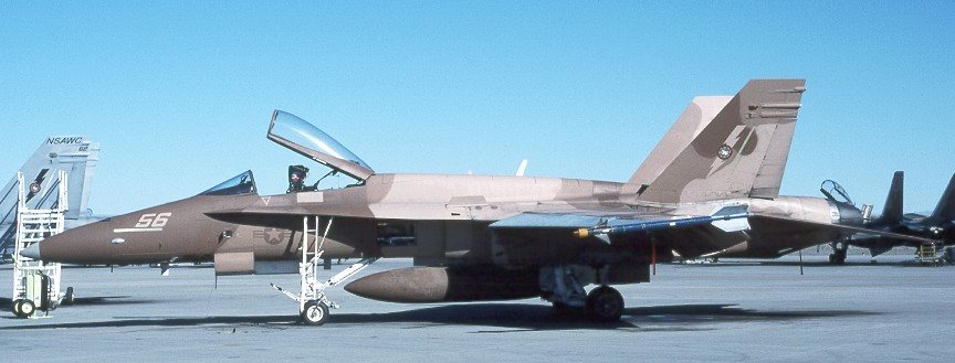 Like F-18s #41, & 52, #56 wears the "standard" adversary paint scheme of tan/brown/brown.