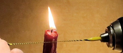 The final diameter of the spiral is a matter of luck and mental feedback. A smaller cord (say, 1/48 scale) would result from faster pulling and twisting, from the start. I tried larger, more round sticks, and they were harder to use – I think because the heating was less uniform through the diameter. Filing the hexagon into a circle improves the result – slightly - but takes more time.