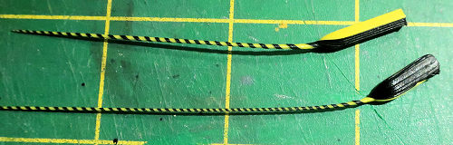 Not having a kit on hand with parts molded in yellow, I made a prototype with a gray and black sprue from two different kits. Results were promising, at best – the plastics used had slightly different properties, and so the softening was not uniform. It was also laborious to scrape the two round sprues into half-rounds.