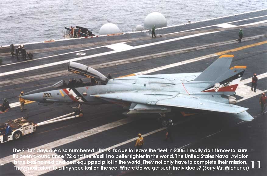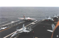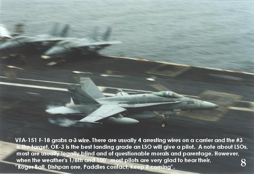 I was pretty jaded when it came to aviation. My Dad was a test pilot and all that really counted in my family were airplanes. I’ve flown professionally, have a commercial pilots license along with multi-engine and instrument ratings and about 1300 hours of flight time. I’d been out on 3 different carriers, helo'ed out once and ridden the boat out twice. I’d even watched F-8s and A-3s land on a small deck 27C boat. I’d flown the E-2/C-2, H-3 and F-14 simulators and even gotten some time in helicopters, gliders, the TA-4 and a Convair 880. I’ve been afforded opportunities to be on the LSO platform (ashore) and watched RF-8s, F-4s, F-18s, F-14s, E-2s and C –2s do Field Carrier Landing Practice (FCLP). I’ve even had the opportunity to wave a couple of FCLP passes and grade them. I thought I was Mr. “Been There, Done That and I’ve got the t-shirt to prove it”. Boy was I about to be cut down to size.