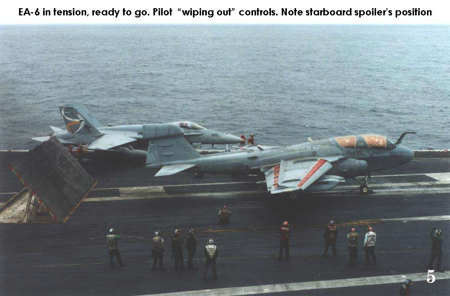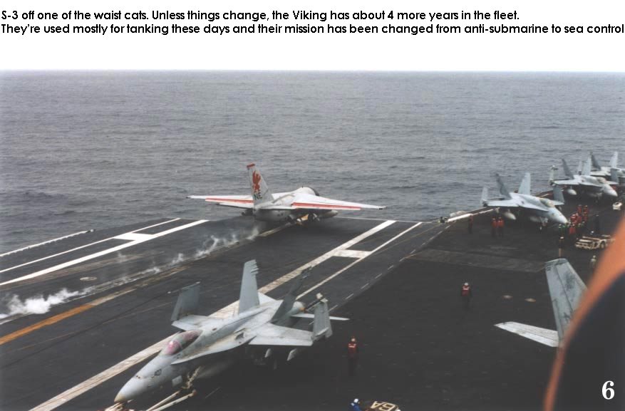 taxied aft and turned onto the catapults. As the airplane turns, groups of the