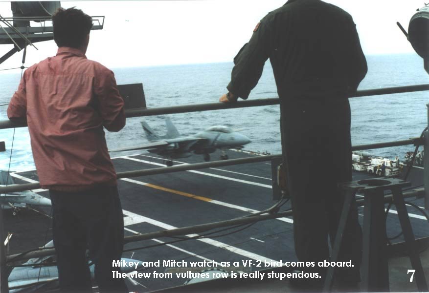 We trekked up 10 deck levels to what’s called “vultures row”, named for all the vultures that congregate to watch flight ops from the best vantage point on the ship. The climb proved to me that carrier life is a young mans game. I surf and try to stay in good shape but I was glad when the climb was over. Mikey and Mitch however, weren’t even winded! (I’m a punk)