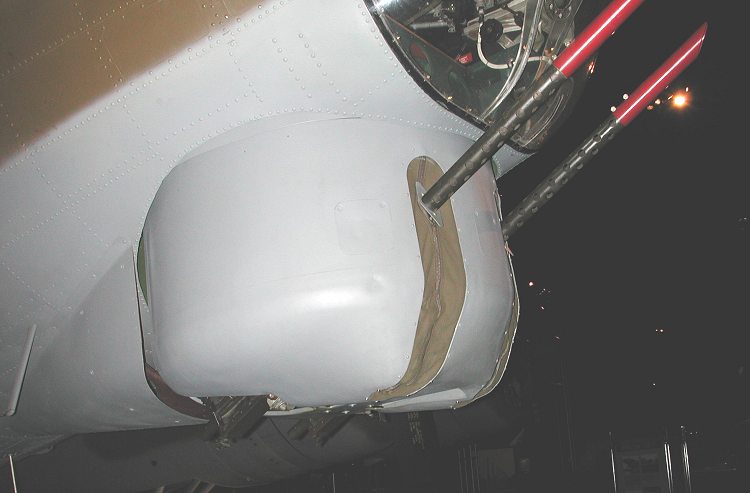 B-17G nose turret. Note the zippered opening, the blast shields and how the rear of the guns protrude below the turret when fully elevated.