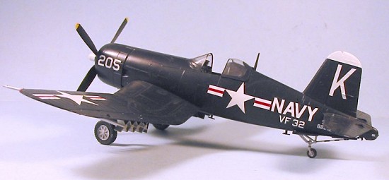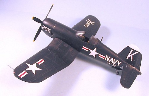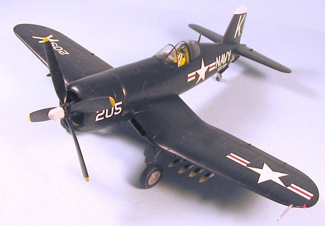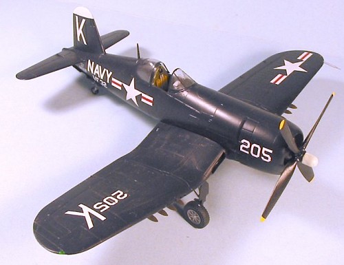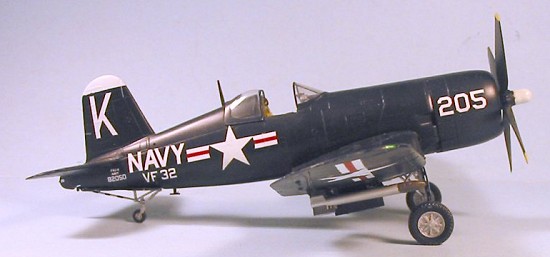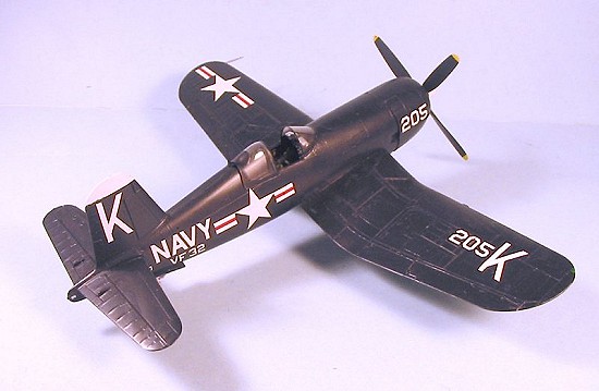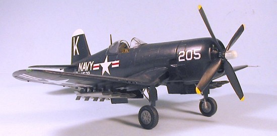 The F4U-4 comes from that period of U.S. Navy airplanes that is very easy to paint: overall Glossy Sea Blue with the landing gear painted aluminum. I used Xtracrylix "Glossy Sea Blue," which I think is the best rendition of this color available, and painted the landing gear with SNJ Aluminum, which stands in well for aluminum lacquer. When the paint was dry, I gave the model a coat Xtracrylix Gloss varnish.