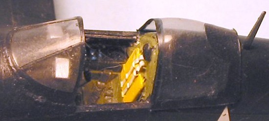 I attached the landing gear, and the vacuformed canopy, which I cut apart and posed open. The underwing rocket rails came from a Tamiya F4U-1D kit, and the rockets from a Hasegawa P-38.