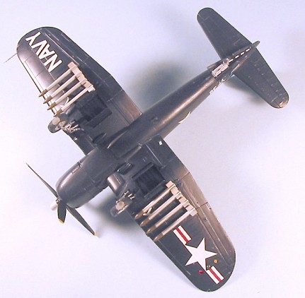 The ultimate Corsair to see service in the Second World War was the F4U-4. The XF4U-4 first flew on April 19, 1944, followed quickly by four other prototypes. The airplane was powered by the R2800-18W, an excellent high-altitude engine that gave the airplane outstanding climb and speed performance up to 35,000 feet, which was what was needed for a fleet defense interceptor, and was equally capable as a fighter-bomber, equipped with two 1,000 lb. bombs or eight 5 inch HVARs. With a top speed of 446 mph at 26,000 feet - a 50 mph improvement over the F4U-1D at the same altitude (the F4U-1D's best rated altitude was 20,000 feet), the F4U-4 was competitive with any other fighter in the world. Production models began arriving in late 1944, and 1,856 had been delivered by the end of the war in August, 1945. The last of 2,056 was delivered in April 1946, and the F4U-4 became the standard fighter-bomber of both the Navy and the Marines in the post-war years.