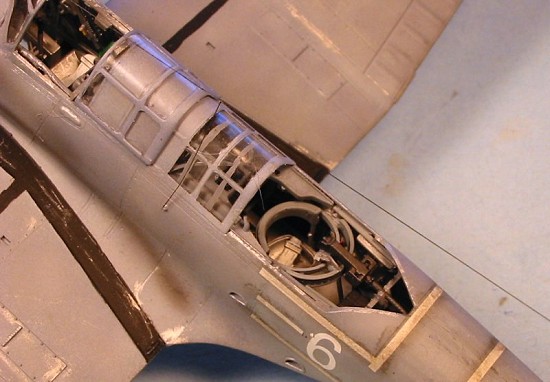 I painted the cockpit aluminum, and then painted the upper rear deck and the turret ring light blue-grey. This is the way the SB2U-2 at the Pensacola Museum is painted, and I suspected the same method might have been used on the SB2U-3s when they were fully camouflaged.