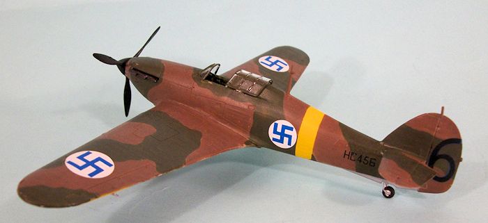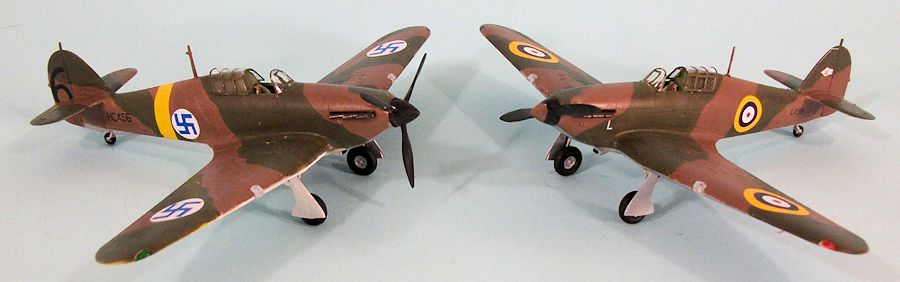 The Xtradecals went on without problem with an application of Micro-Sol. Both models were given a coat of Xtracrylix Flat varnish, then the landing gear, exhausts, venturis, radio masts and propellers were attached. The windscreens were attached using white glue to fill any gap, while a drop of CA glue to the lower edges of each of the canopies allowed them to be positioned open. (Just a quick note that, according to photographs of the plane, the Finnish Hurricane HC-456 had the straight antenna mast and the '6' was outlined in light blue. These images are in the recently reviewed book on Finnish Fighter Colors, vol 2. Ed)
