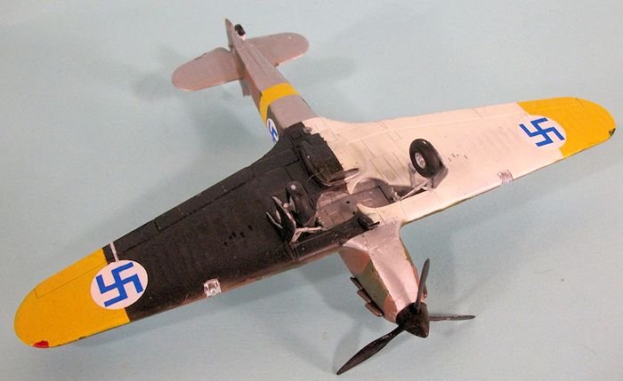 For the Finnish Hurricane, I painted the yellow theater markings and masked them off, then the white wing, followed by the black wing, then the aluminum fuselage and lower horizontal stabilizers, masking off each in turn. The RAF Hurricane was painted with Model Master Aluminum with Model Master Sealer, which looks very much like painted Aluminum dope.