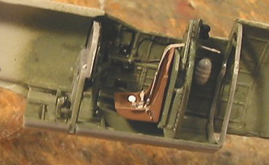 Once I was sure the parts fit right, I proceeded to paint and assemble the cockpit, using Xtracrylix British Interior Green and Black for the cockpit, and Schockolade Braun for the seat . Since I had the Eduard photoetch set for the Spitfire IX that was developed for the Airfix kit, I used this and replaced the instrument panel with the Eduard photoetched one, as well as other small detail parts in the cockpit. I also used the seatbelts from the Eduard set. When the Hasegawa cockpit was assembled, I glued it into the Aeroclub fuselage halves, after cutting out the side flap area and glued the fuselage together.