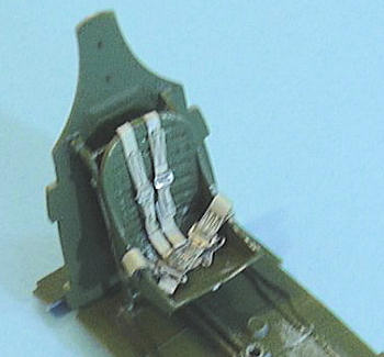 I then assembled the cockpit. I used Eduard USAAF seat belts for this. The P-40E-1, aka the "Kittyhawk I" - came out of the factory with US seat belts. The RAF Sutton harness was installed once delivered to the RAF. In Australia, there was a lack of time for all this, so both American units using "reverse Lend-Lease" Kittyhawks, as well as RAAF units, could find themselves using airplanes equipped with either the USAAF or RAF seatbelts, depending on whether the airplane had been through a maintenance depot before being issued to a squadron. The cockpit is very nice out of the box; installing the seatbelts (whichever you use) is all you really need to do here.