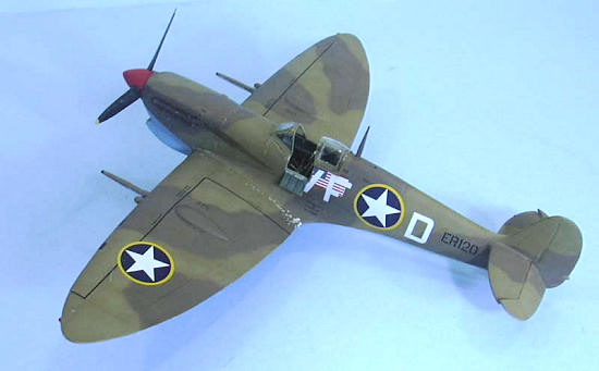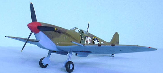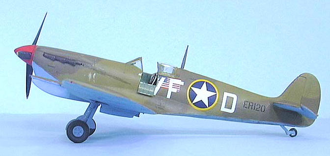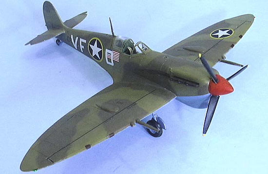 I decided to do the model as the original might have looked at about the time of the invasion of North Africa, so it would be relatively clean and mostly un-dinged. Photos of Spitfires operated in North Africa by the 31st FG show them faded and dinged a lot by the Spring of 1943, so one could really go to town on this scheme if they so wished. After applying some exhaust stains and dings where the pilot would board the airplane, I gave the model a coat of Xtracrylix Flat Varnish with a brushful of Tamiya Flat Base to give it the sun-weathered look that comes quickly in North Africa. I attached the landing gear, prop and canopy, and the model was finished.