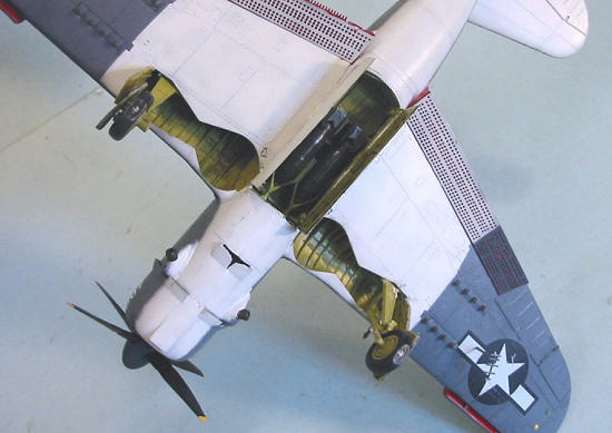 The cockpit was painted with Xtracrylix “Interior Green,” while the bomb bay, wheel wells and gear doors, and interior of the engine cowling, were painted with Tamiya “Yellow-green” which is a good color for Zinc Chromate. The interiors of the dive flaps and the interior area of the Handley-Page flaps were painted with Tamiya “Flat Red.”