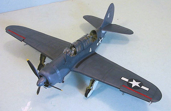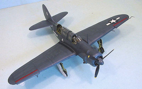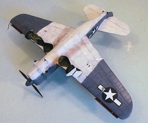 Photos in the two Helldiver books I have show that these VB-17 Helldivers hadn’t had much opportunity to be "dinged" by the time of the Rabaul Raid (though the paint got seriously corroded from the salt air, as well as faded from the tropic sun over the course of their tour). I left the model pretty clean, other than exhaust stains and oil stains inside the wheel wells and on the landing gear and gear doors, which was created by spraying the area with Tamiya Smoke. The landing gear, prop and canopies were attached.