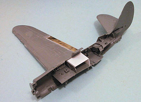 I also decided to close up the bomb bay, so I cut the doors free of the adjoining structure parts, and glued them to each fuselage half, reinforcing the joint on the inside with some Evergreen strip.