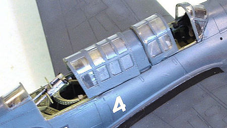 4. The sliding canopy over the gunner’s cockpit does not have the modifications of the SB2C-4 canopy for lessening turbulence; the sliding area of the fuselage to either side of the gunner’s cockpit must be modified with the roller removed from the canopy and the railing changed.