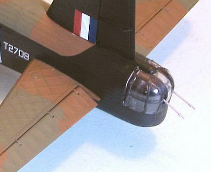 There is one other point to make about interior detail, and that is the dustbin turret the kit supplies. So far as I know, the Wellington IC didn't carry this, only the Wellington IA. The turret was never extended while the aircraft was on the ground. Since the Wellington IC did have a plate over the turret opening, to make the kit correctly and not waste time on something that can't be seen anyway, merely attach the bottom piece of the turret - without any of the various bits and pieces - to the fuselage. I did this before joining the fuselage halves, which allowed me to superglue it in position on the one side. If you're clumsy like me, you'll appreciate having those two nice thin gun barrels you won't be using on that turret available to replace any guns broken in one of the turrets.