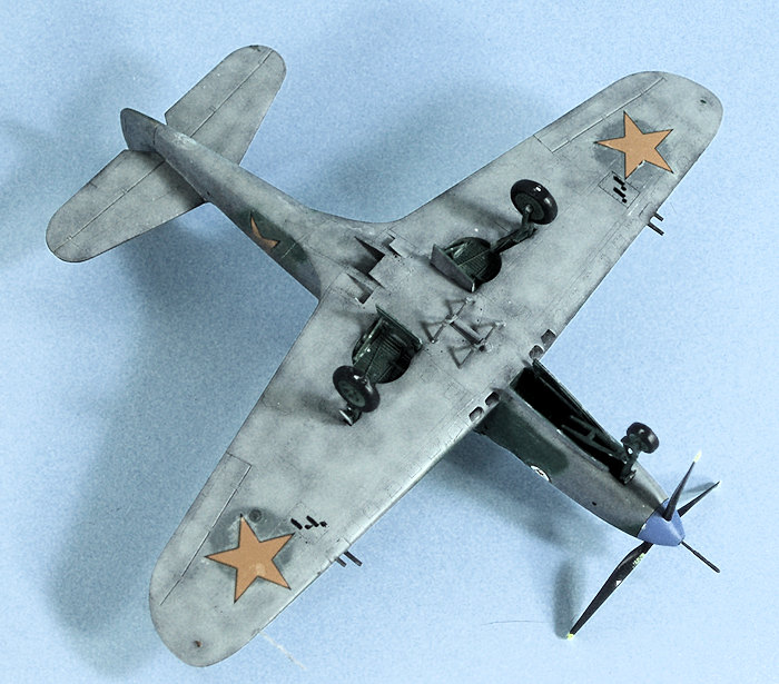 Since these airplanes saw hard service, I dinged the model and applied heavy exhaust stains. I cut off the lower main gear doors, as I found several photos of the airplanes with the doors removed for operation from muddy Russian airfields.