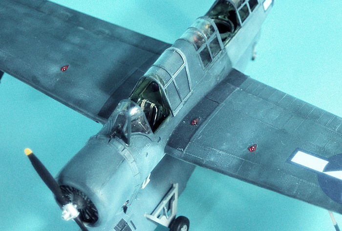 The canopies were unmasked and attached. I placed the canopy over the radioman’s seat under the forward canopy glass, and it fit perfectly. I then attached the beaching gear.