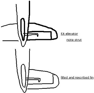 Around this time I decided to add the Horizontal Stabs and elevators. Immediately I noticed something amiss. After a bit of head scratching I realized the engraved line for the elevator and balance horn were engraved on BACKWARDS! (See drawing 1) I’m not sure if all are like this, but mine was definitely goofed up. I filled in the joint with putty and CYA, sanded and rescribed. The way the kit engraving was done would have the support strut attached to the elevator instead of the Stab. Somehow I think this design would lead to pitch control problems! Anyway it’s a quick no hassle fix…