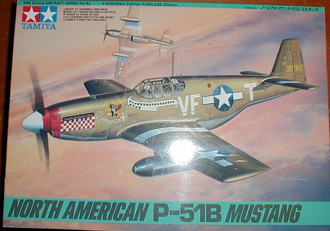 Tamiya’s P-51B kit is arguably the best of the type in the 48th scale, and by all means the best fitting. Upon opening the box, I was very happy to see some of the finest molding I have ever come across. This kit lives up to the Tamiya name very well. There are 3 sprues and 3 decal options printed on Tamiya’s Invisiclear sheet. There is also ordinance in the way of drop tanks and bombs, a very nice touch. There are 2 types of exhaust and an option for a Malcolm hood or even a very nice molded open "B" canopy.