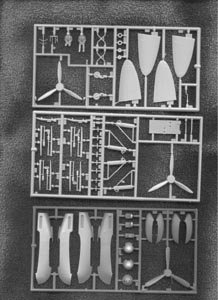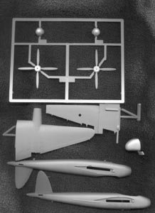The kit can be used to build a number of Mosquito variants. The kit’s nose, with the Serrate antenna and four .303s, will make a NF Mk II, or the nose can be removed and replaced by the “bull nose” of the NF XIX/30. You can do a FB Mk IV with under wing ordnance. Narrow chord and paddle bladed props are included, and a white plastic sprue has the four bladed props of the post-war Swedish J.30 on the box cover. Shielded and unshielded exhausts are provided, plus slipper tanks, eight 60 LB rockets, and two 500 LB bombs. Basically you can build any non-bomber Mosquito you want.