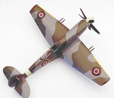 I used Polly Scale acrylics throughout, Ocean Grey and Dark Green for the topsides, Sea Grey for the undersides, and Sky Type S for the fuselage band and spinner. Future was applied in the areas where the decals would be attached, to eliminate silvering. The decals were of high quality, although by the time I got the leading edge stripes soft enough to wrap around the wing, they were also soft enough to tear...next time out I'll paint those bands. The manufacturer's data for the prop blades were too heavy handed, so I left them off entirely. The kit was then hung from the slots for the exhaust stacks, and given three light airbrushed coats of Future. The real aircraft had a glassy surface, so well polished that the fuselage roundels can be seen reflected in the wings in some photographs. Boundaries between colors were hard-edged, and very little exhaust staining is visible.