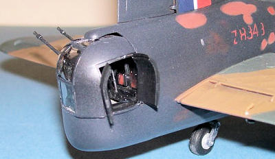 The machine guns were inserted thru the front openings of the turrets and after some trials glued in place (after receiving a dry brush of aluminum to highlight some details). I glued the two tail turret doors.