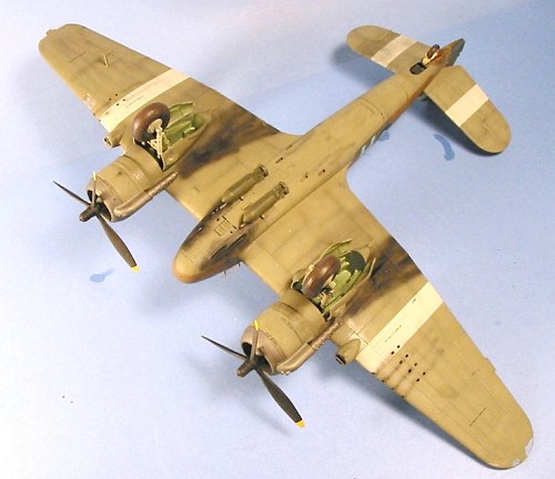 The Beaufighters used in SEAC were repainted from the factory-applied Temperate Sea Scheme to the Temperate Land Scheme of Dark Earth and Dark Green over Medium Sea Grey. I used Gunze-Sangyo paints for the upper surface and Tamiya “Medium Grey” for the lower color. The model was first pre-shaded with flat black along the panel lines, then the lower color was applied and masked off. The upper camouflage was done using masks made from drafting tape, with thread run along the edge 1/16" inboard, to provide a “hard” edge without having any paint buildup into a ridge as happens when the masking is applied directly to the edge of the pattern.