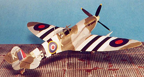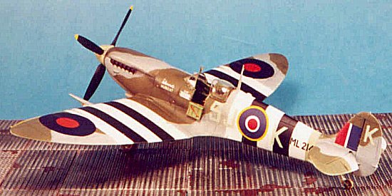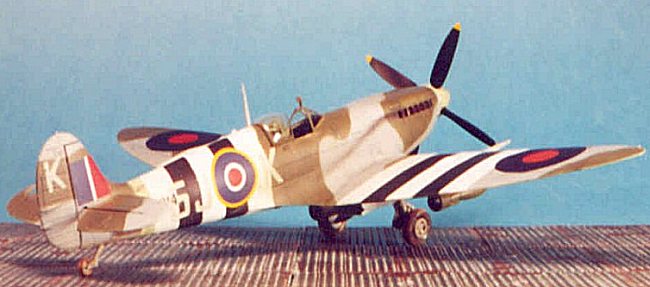 I decided I was going to do a different airplane from that available through the kit decals, and decided I wanted to do an invasion fighter-bomber. I had the Super-Scale decal sheet 48-563, "Mk.IX Spitfire Aces," and decided to to John Plagis ML214, 5J-K, which is in full D-Day regalia. If you choose to use this sheet, try to get one of the earlier ones where the sky decals are the proper shade; SuperScale has decided that "Sky" means "Sky Blue" on their more recent printings. The earlier one is a dead match to Tamiya "Sky." Aeromaster also has Plagis' airplane on two different "Spitfires at War" sheets.