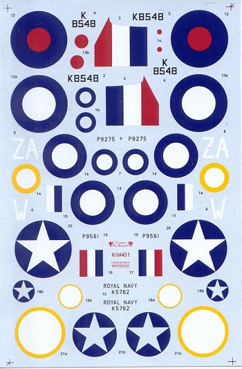 Decals are provided for four Walruses, three operated by the Royal Navy and one by the RAAF. One of the RN possibilities is a Walrus used during Operation "torch", with U.S. insignia, while another is for a Walrus operated during the Norwegian campaign aboard H.M.S. "Shropshire." As I understand it, Classic Airframes has created an aftermarket decal sheet for the Walrus that includes the airplane involved in the rescue in Tokyo Bay described above.