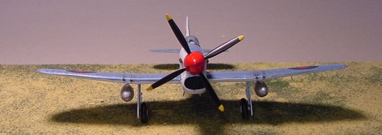 Added on the upper antennae made from stretched sprue, and the lower pitot tube as well. The spinner hub was painted gloss red, and the plane was finished !