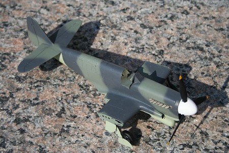 The camouflage was made up of Tamiya RLM Grey XF-22, which was a stand in for Dark Slate Grey, and Gunze Extra Dark Sea Grey H333. The results are very formidable, as you can see! Prior to that, the undersides were masked with Tamiya masking tape, the rounded pattern near the stabilizer was achieved with 3M masking tape.
