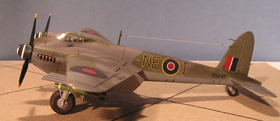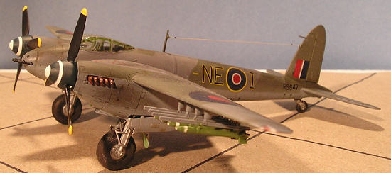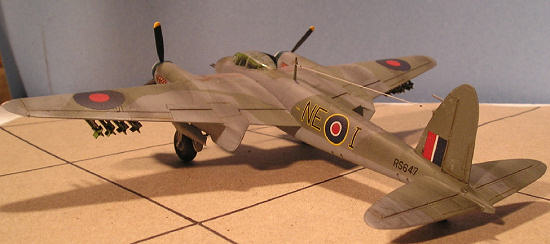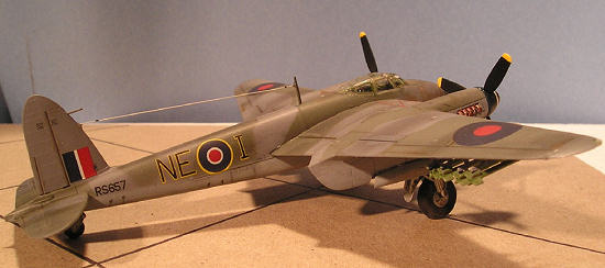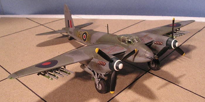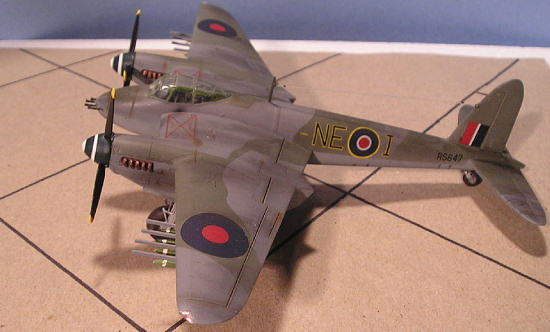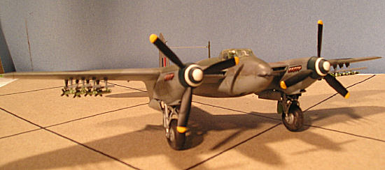 In 1938, the Gunter brothers completed work on the He119, built on the principle that a streamlined design incorporating speed could outrun current fighters. This met a stone wall of resistance in the RLM (Reichsluftfartministerium). This did not deter Geoffry de Havilland, however, and he pressed his arguments before the Air Ministry in Britain. He argued that his wooden laminate design, incorporating the latest engine technology in the form of the Rolls-Royce Merlin engines, could indeed outrun current fighter designs with sheer speed. With an ally in Air Marshall Sir Wilfrid Freeman, Air Member for R&D on the Air Council, and the fact that the RAF lacked a long-range reconnaissance aircraft, the de Havilland Company won their argument, despite Lord Beaverbrook’s arguments for fighters, fighters, and more fighters, since England’s back was against the wall engaging the Luftwaffe in the Battle of Britain. The prototype D.H. 98 flew for the first time from Hatfield on October 1, 1940. The production aircraft, built at Salisbury Hall, were divided into four purpose-built categories of photo-recon, bomber, night fighter, and fighter-bomber, and provided sterling service in their roles. Among the more famous missions that the Mosquito undertook were the Dutch Central Population Registry raid against the Gestapo on 11 April, 1944, and the Jena raid on 27 May 1943, in examples of low-level precision bombing. Also of note are the sorties flown against German iron ore transports and U-boats in the Kattgatt in 1944 and 1945. My model depicts a hypothetical (though fictitious) aircraft flown by the Banf Strike Fighter Wing, based in Scottland during late 1944 into 1945.