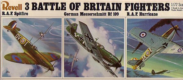 Revell had a large series of WW1 and WW2 fighters in the 1960s. A number of them were also released as three-packs. There were a couple of WW1 threesomes, and sets from both the European and Pacific theaters of WW2. This set brings together the Spitfire, Hurricane, and Bf-109.