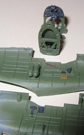 The cockpit is assembled out of the model, and then fitted into place from underneath before the wing goes on. I painted the pieces while they were on the sprue, and then assembled them, touching up the paint as I went. The instrument panel features raised detail. I just painted the panel black, and then dry brushed with silver to highlight the instrument rings. Some dabs of Future to simulate the glass completed the panel. In hindsight, even that is probably overdoing it, as you can’t really see the results in the finished model.
