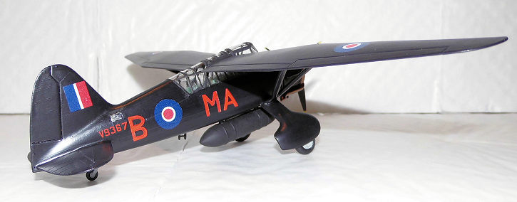 When decals and paint touch ups had dried the whole model got a coat of Humbrol Matt Cote except the cowling to have a spot to hold on! The cowling front plus the exhaust pipe got a couple of coats of antique bronze (Humbrol 171), the ladder and fuel tank painted flat black. Final touch up with the Matt Cote (including the cowling) plus attaching the last items including the landing lights, which were punched out of aluminumtape, and my spy Lysander was finished.