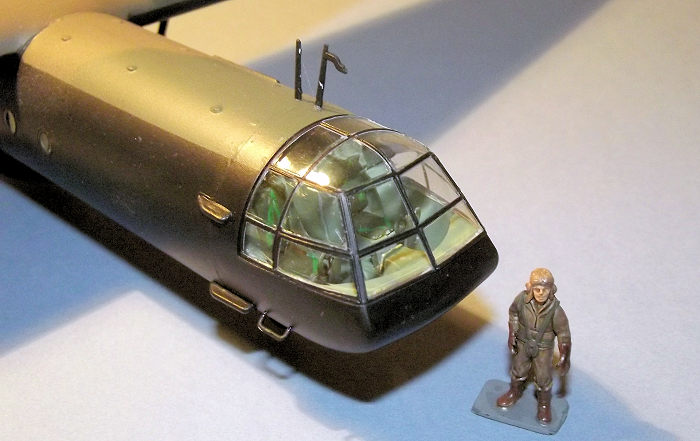 In the absence of engine nacelles and retractable landing gear this promised to be a fairly simple build. The nose and cockpit section is a separate unit and it is convenient to assemble this first adding the floor, rear bulkhead, seats, control sticks, pedals and instrument console. The whole was sprayed inside with Tamiya XF-71 Cockpit Green and while the airbrush was loaded, the same colour applied to inside of the main fuselage halves. I had no plans to detail the interior of the fuselage, since the side access doors were to be glued shut and virtually nothing could be seen through the tiny circular porthole-type windows in the fuselage sides. Italeri provide flooring and bench seating for the fuselage interior, which I omitted for the reason that it would not be seen and in the futile hope that by reducing weight in the rear of the fuselage it might balance on its landing gear